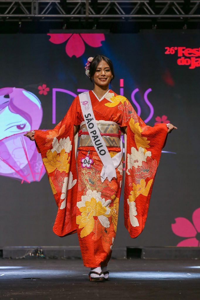 Neste ano, como uma homenagem especial aos 130 anos do Tratado de Amizade Brasil-Japão, as candidatas desfilarão com o tradicional kimono furisode, considerado um dos trajes mais elegantes da cultura japonesa. Este tipo de kimono se destaca pelas suas longas mangas soltas e coloridas, sendo tradicionalmente usado por mulheres solteiras em ocasiões formais. Sua beleza e simbolismo representam juventude, elegância e respeito às tradições ancestrais.